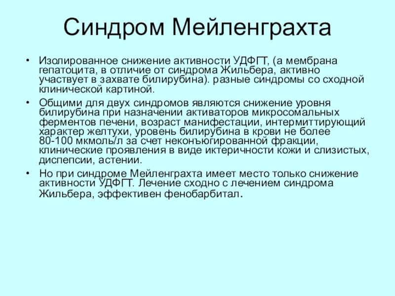 Но при синдроме Мейленграхта имеет место только снижение активности УДФГТ. Лечение сходно с лечением синдрома Жильбера, эффективен фенобарбитал.
