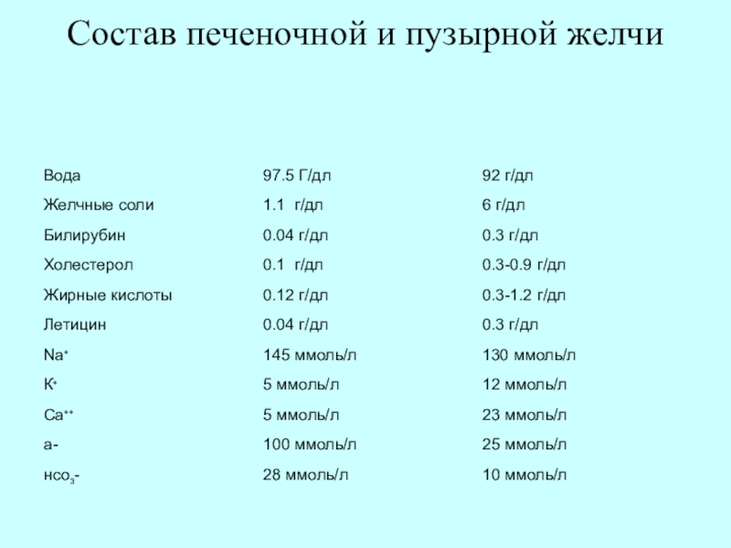 Слайд 44Состав печеночной и пузырной желчи