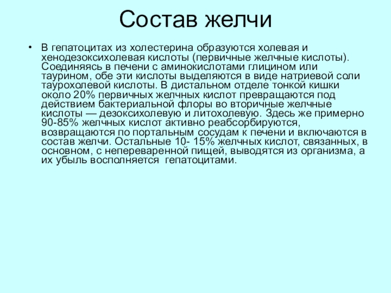 таурином, обе эти кислоты выделяются в виде натриевой соли таурохолевой кислоты. В дистальном отделе тонкой кишки около 20% первичных желчных кислот превращаются под действием бактериальной флоры во вторичные желчные кислоты — дезоксихолевую и литохолевую. Здесь же примерно 90-85% желчных кислот активно реабсорбируются, возвращаются по портальным сосудам к печени и включаются в состав желчи. Остальные 10- 15% желчных кислот, связанных, в основном, с непереваренной пищей, выводятся из организма, а их убыль восполняется гепатоцитами.