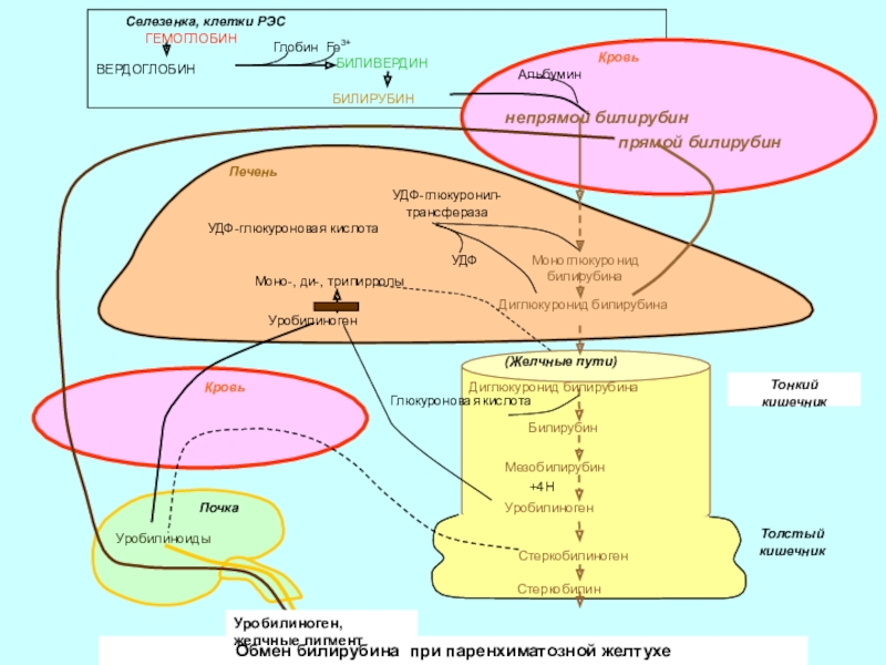 Слайд 26Обмен билирубина при паренхиматозной желтухе
