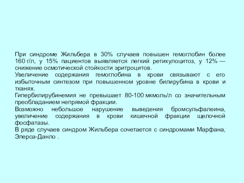Слайд 33При синдроме Жильбера в 30% случаев повышен гемоглобин более 160 г/л,