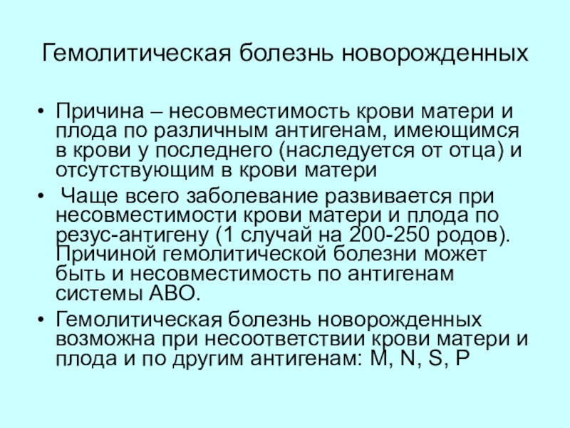 Чаще всего заболевание развивается при несовместимости крови матери и плода по резус-антигену (1 случай на 200-250 родов). Причиной гемолитической болезни может быть и несовместимость по антигенам системы АВО.