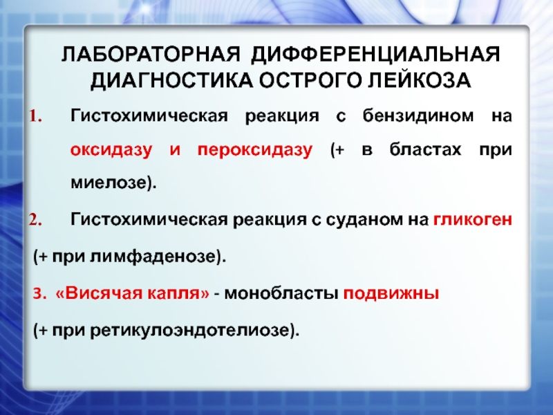 Слайд 65ЛАБОРАТОРНАЯ ДИФФЕРЕНЦИАЛЬНАЯ ДИАГНОСТИКА ОСТРОГО ЛЕЙКОЗА