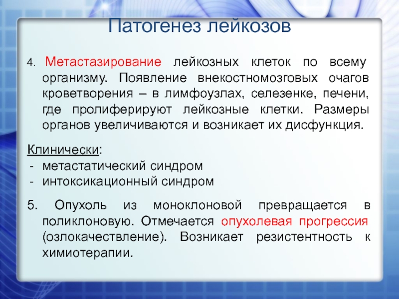 4. Метастазирование лейкозных клеток по всему организму. Появление внекостномозговых