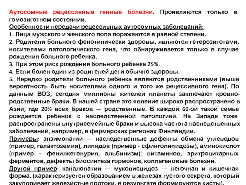 Слайд 53Аутосомные рецессивные генные болезни. Проявляются только в гомозиготном состоянии.