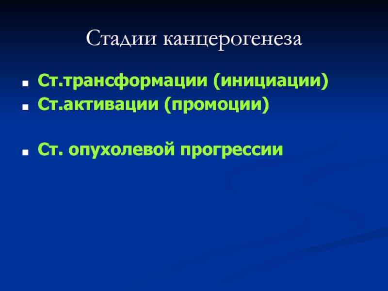 Стадии канцерогенезаСт.трансформации (инициации)Ст.активации (промоции)Ст. опухолевой прогрессии