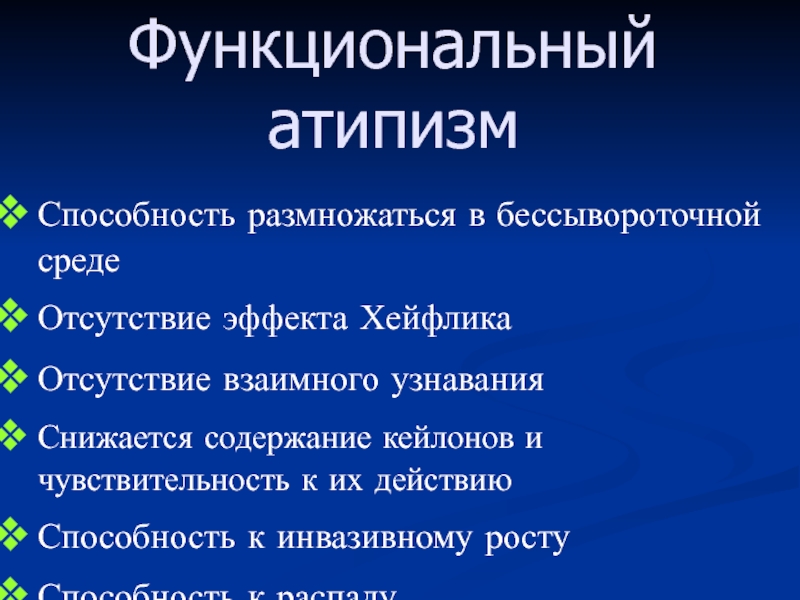 Функциональный атипизмСпособность размножаться в бессывороточной средеОтсутствие эффекта ХейфликаОтсутствие взаимного узнаванияСнижается содержание кейлонов и чувствительность к их действиюСпособность
