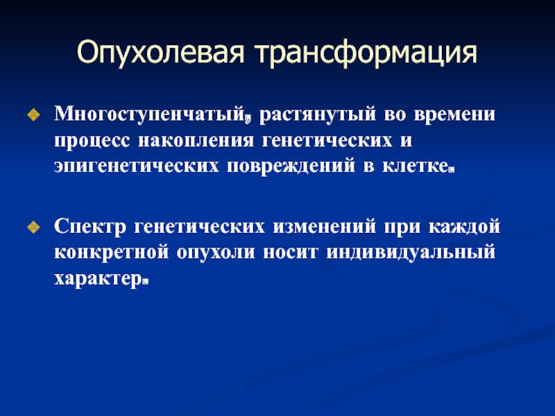 Опухолевая трансформацияМногоступенчатый, растянутый во времени процесс накопления генетических и эпигенетических повреждений в клетке.Спектр генетических изменений при каждой