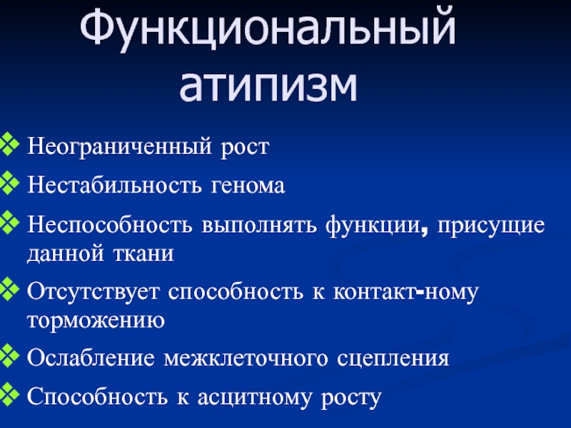 Функциональный атипизмНеограниченный ростНестабильность геномаНеспособность выполнять функции, присущие данной тканиОтсутствует способность к контакт-ному торможениюОслабление межклеточного сцепленияСпособность к асцитному