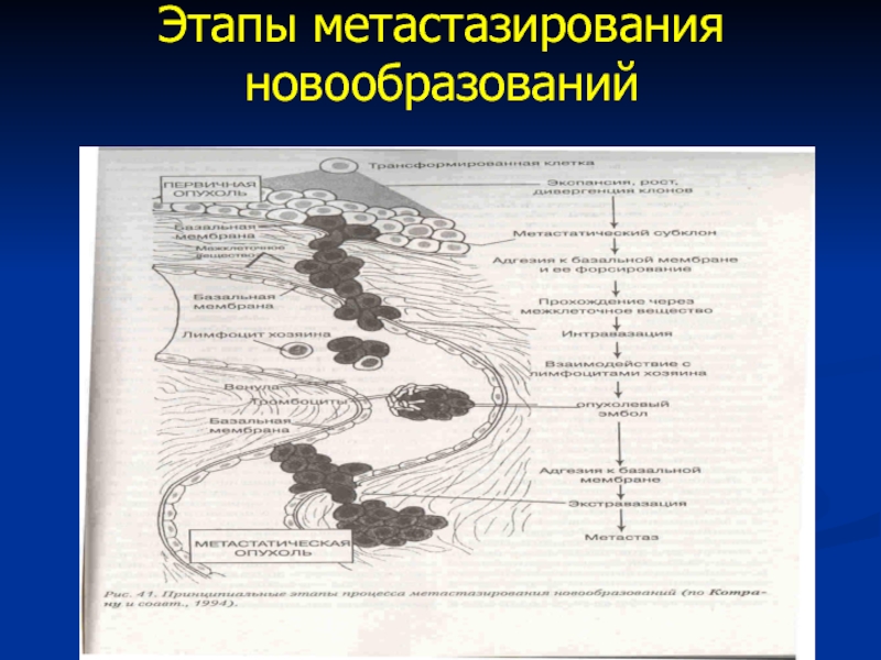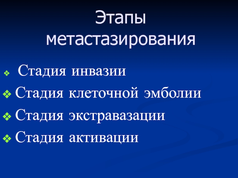 Этапы метастазирования Стадия инвазииСтадия клеточной эмболииСтадия экстравазацииСтадия активации