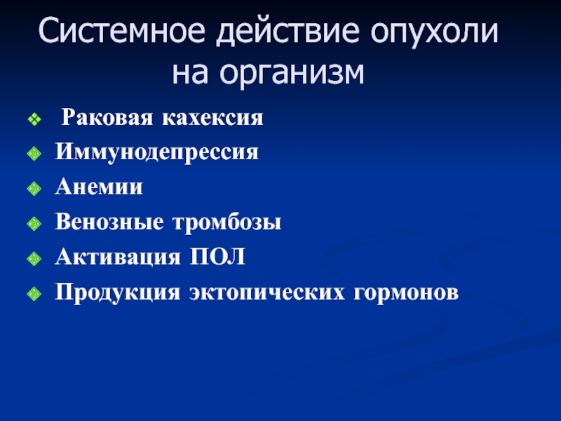 Системное действие опухоли на организм Раковая кахексияИммунодепрессияАнемииВенозные тромбозыАктивация ПОЛПродукция эктопических гормонов