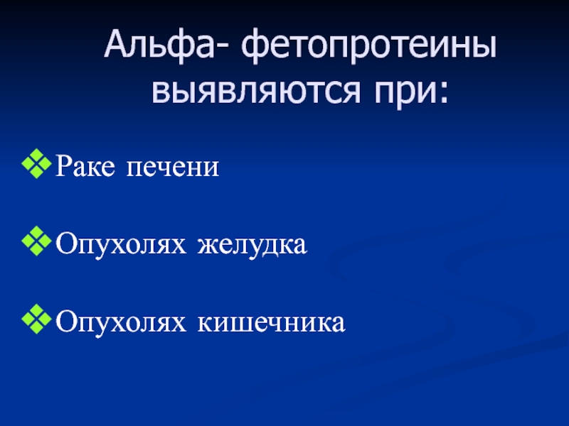 Альфа- фетопротеины выявляются при:Раке печениОпухолях желудкаОпухолях кишечника