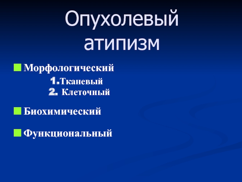 Опухолевый  атипизмМорфологический     1.Тканевый      2. КлеточныйБиохимическийФункциональный