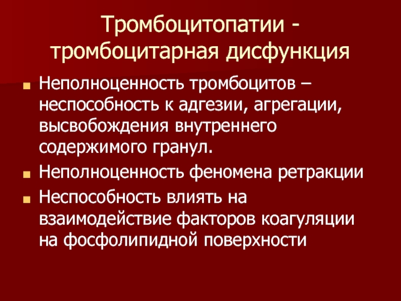 Слайд 58Тромбоцитопатии - тромбоцитарная дисфункция