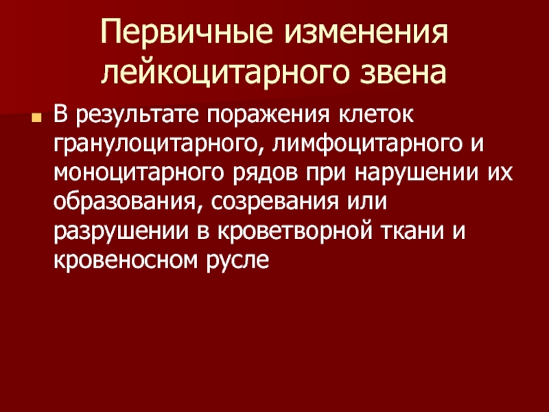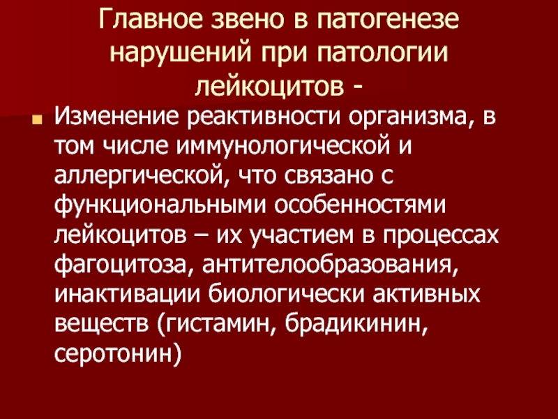 Слайд 5Главное звено в патогенезе нарушений при патологии лейкоцитов -