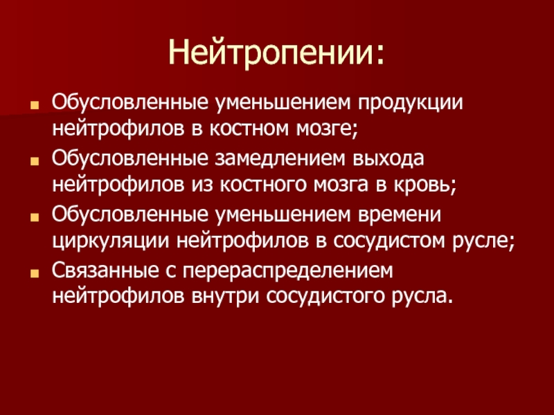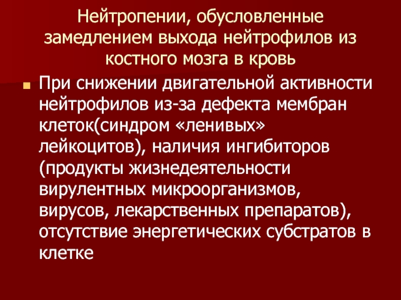 Слайд 13Нейтропении, обусловленные замедлением выхода нейтрофилов из костного мозга в кровь