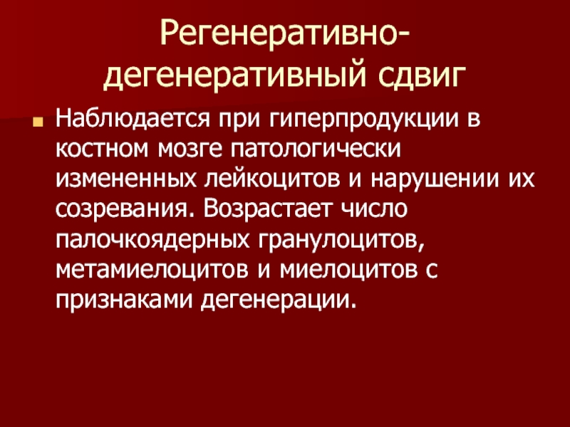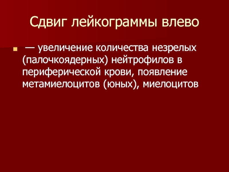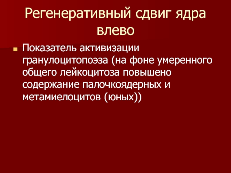 и нарушении их созревания. Возрастает число палочкоядерных гранулоцитов, метамиелоцитов и