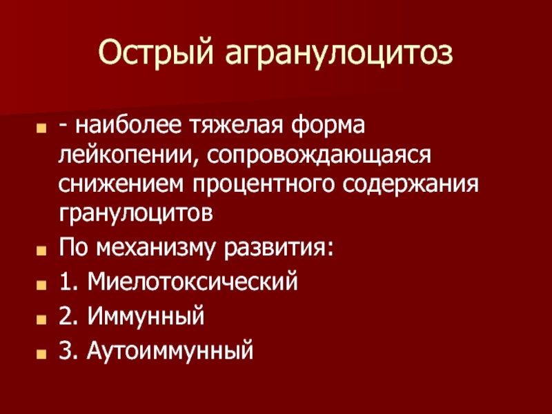 - наиболее тяжелая форма лейкопении, сопровождающаяся снижением процентного содержания
