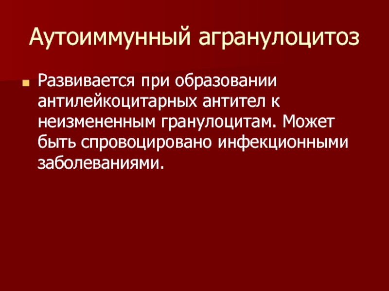 Развивается при образовании антилейкоцитарных антител к неизмененным гранулоцитам. Может