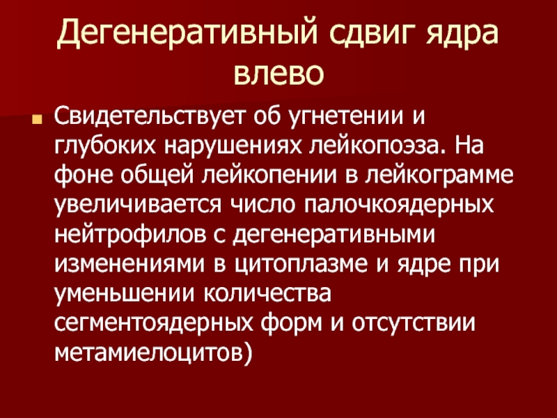 с дегенеративными изменениями в цитоплазме и ядре при уменьшении количества сегментоядерных форм и отсутствии метамиелоцитов)
