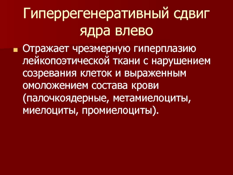 созревания клеток и выраженным омоложением состава крови (палочкоядерные, метамиелоциты, миелоциты,