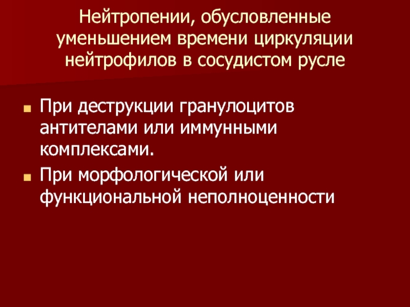 Слайд 14Нейтропении, обусловленные уменьшением времени циркуляции нейтрофилов в сосудистом русле