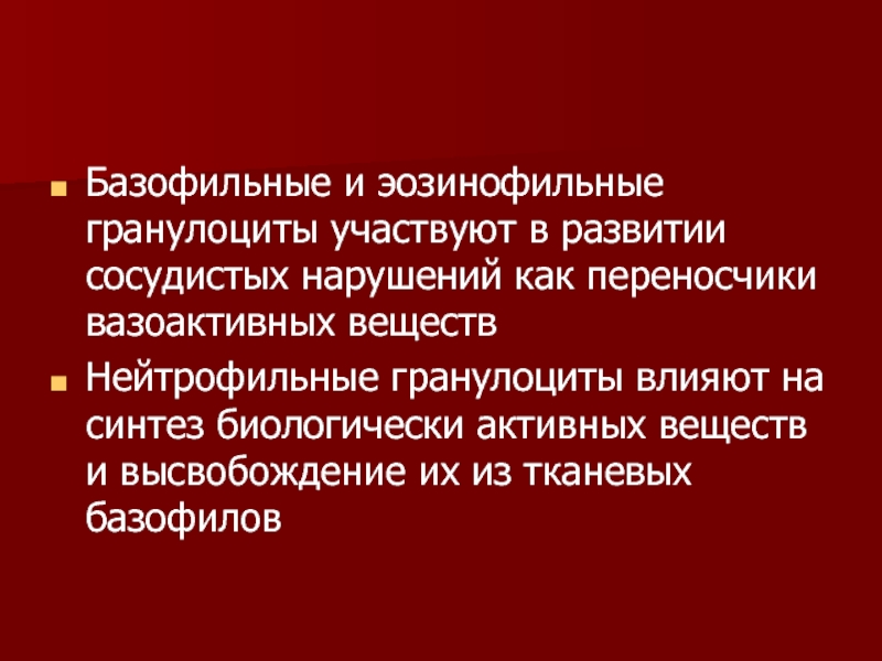 Слайд 7Базофильные и эозинофильные гранулоциты участвуют в развитии сосудистых нарушений как