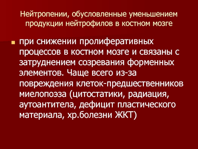 Слайд 12Нейтропении, обусловленные уменьшением продукции нейтрофилов в костном мозге
