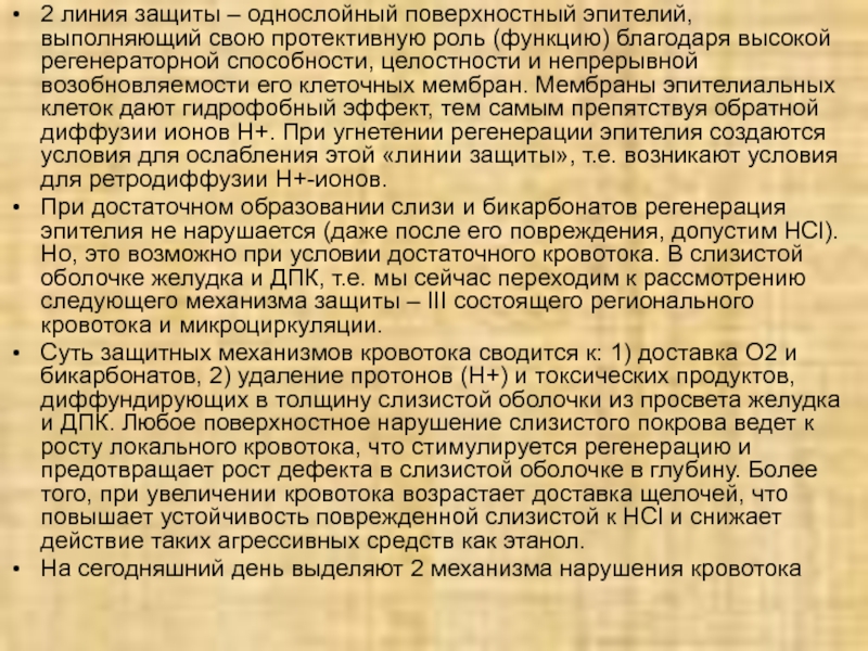его клеточных мембран. Мембраны эпителиальных клеток дают гидрофобный эффект, тем самым препятствуя обратной диффузии ионов Н+. При угнетении регенерации эпителия создаются условия для ослабления этой «линии защиты», т.е. возникают условия для ретродиффузии Н+-ионов.