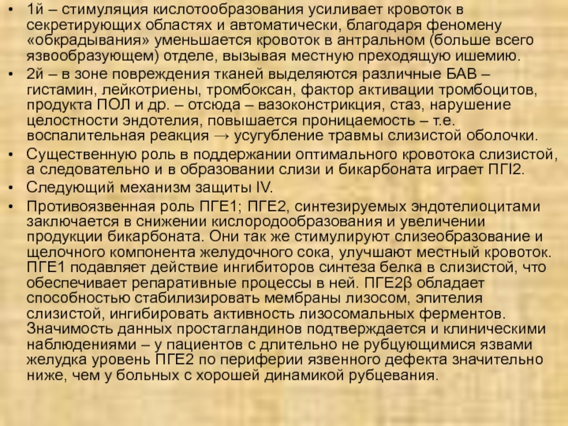 1й – стимуляция кислотообразования усиливает кровоток в секретирующих областях и
