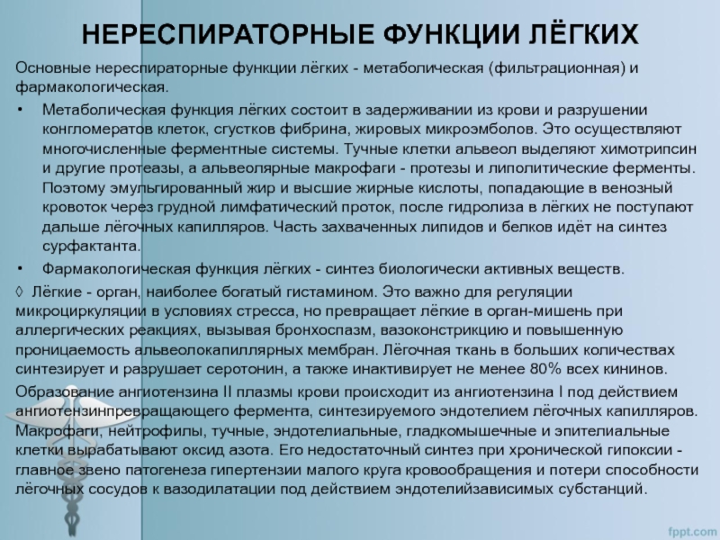 Лёгкие выполняют и нереспираторные функции (инактивация ангиотензинконвертазы, адреналина, норадреналина, серотонина, гистамина, брадикинина, простагландинов, утилизация липидов, генерация и инактивация активных форм кислорода).