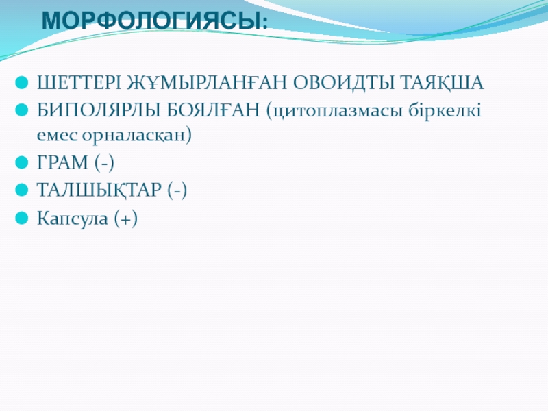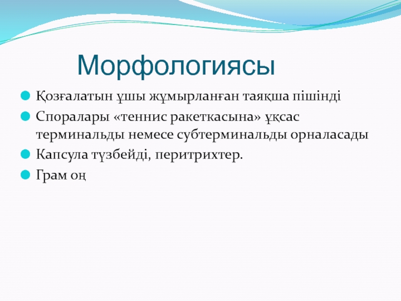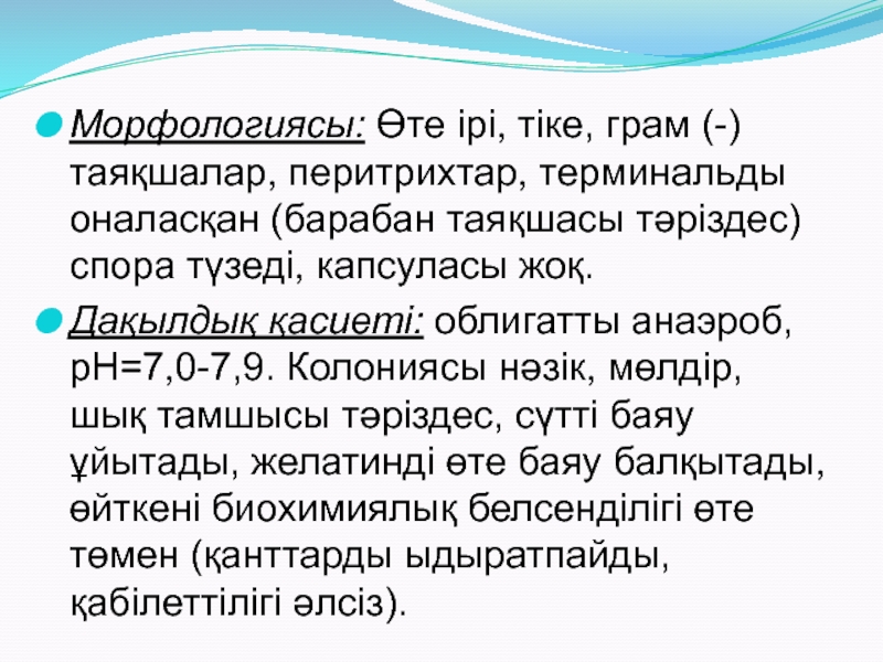 Слайд 10Морфологиясы: Таяқша, Гр(+), капсуласы бар, талшықтары жоқ, спорасы бар (субтерминальды
