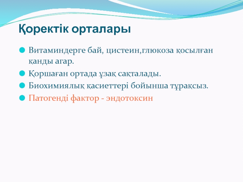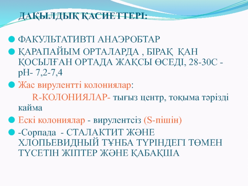 Дақылдық қасиеті: рН – 6,0-8,0. Қанды агарда – колониясы