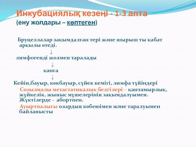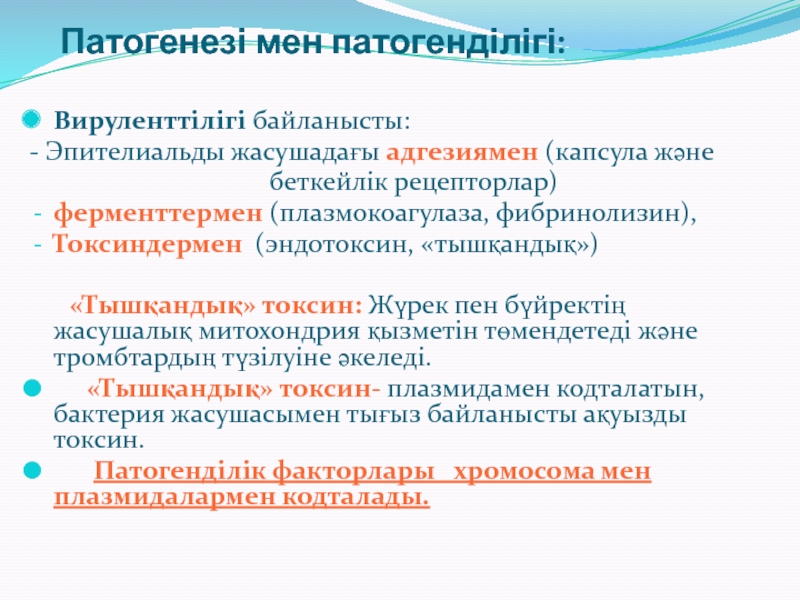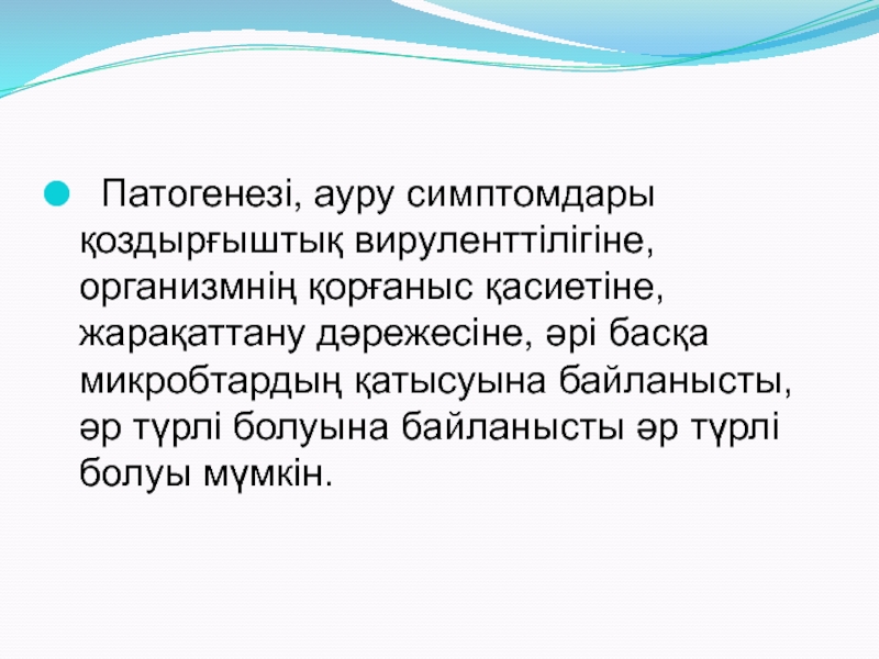 Слайд 14 Патогенезі, ауру симптомдары қоздырғыштық вируленттілігіне, организмнің қорғаныс қасиетіне, жарақаттану