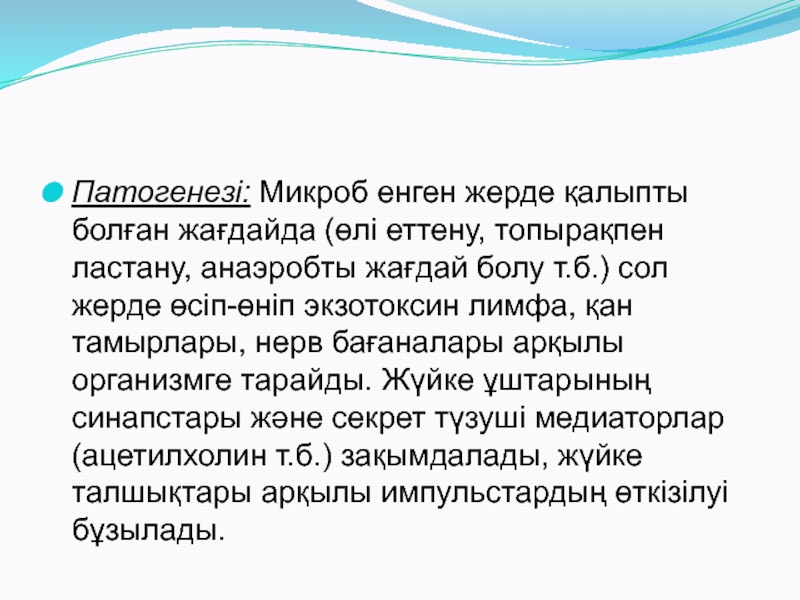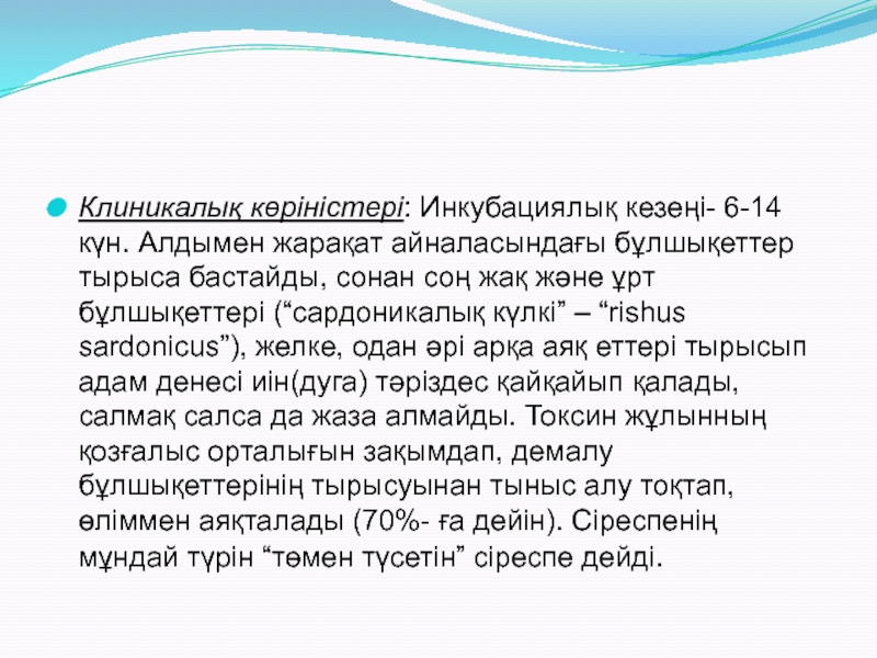 Слайд 16Сіреспе- ОЖЖ қозғалтқыш жасушаларын зақымдап, тоникалық және клоникалық сіреспе тудыратын