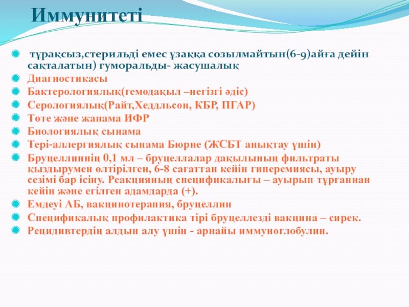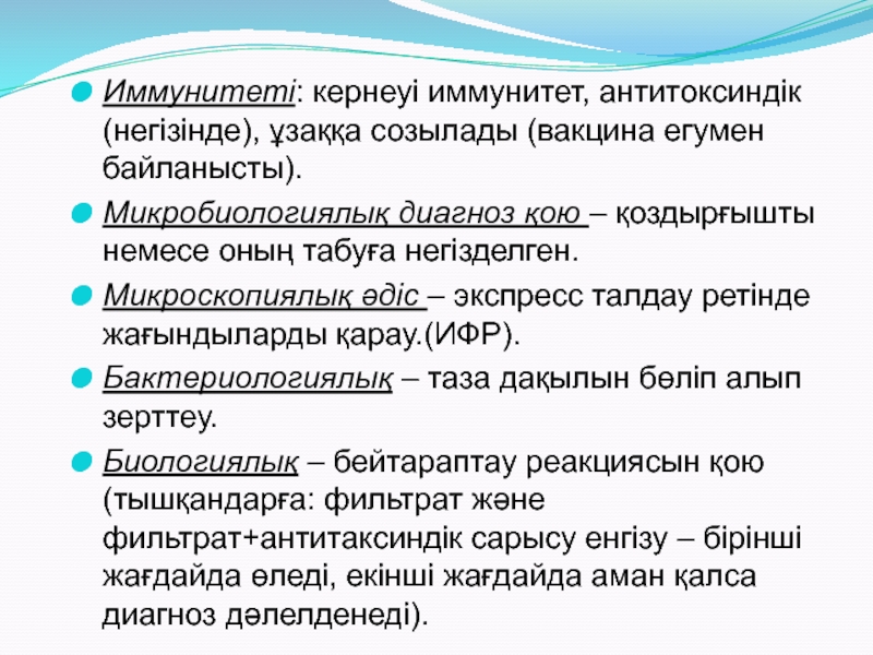 Слайд 17Иммунитеті - антитаксиндік антибоктериялық кезеғңі емес, әлсіз ұзаққа созылмайды, иммунитет