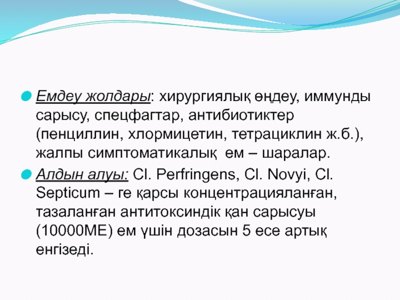 Слайд 18Емдеу жолдары: хирургиялық өңдеу, иммунды сарысу, спецфагтар, антибиотиктер (пенциллин, хлормицетин,