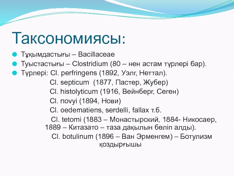 Cl. tetomi (1883 – Монастырский, 1884- Никосаер, 1889 – Китазато – таза дақылын бөліп алды).