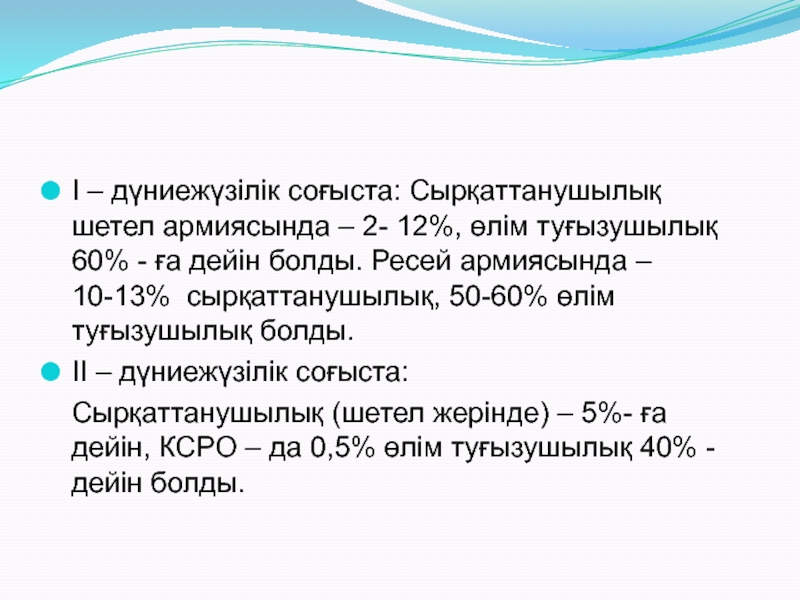 Слайд 9І – дүниежүзілік соғыста: Сырқаттанушылық шетел армиясында – 2- 12%,