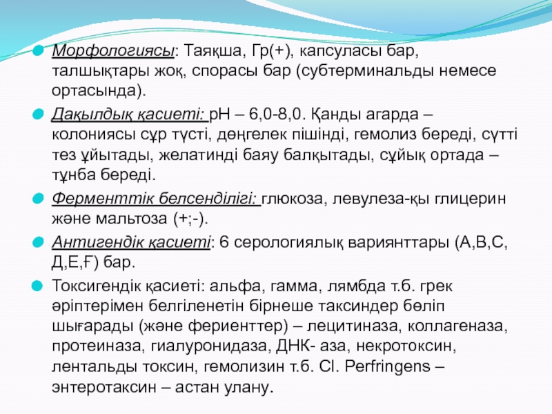 Токсигендік қасиеті: альфа, гамма, лямбда т.б. грек әріптерімен белгіленетін бірнеше таксиндер бөліп шығарады (және фериенттер) – лецитиназа, коллагеназа, протеиназа, гиалуронидаза, ДНК- аза, некротоксин,лентальды токсин, гемолизин т.б. Cl. Perfringens – энтеротаксин – астан улану.