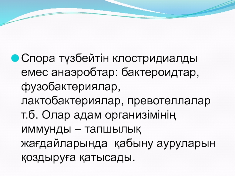 Слайд 7Спора түзбейтін клостридиалды емес анаэробтар: бактероидтар, фузобактериялар, лактобактериялар, превотеллалар т.б.