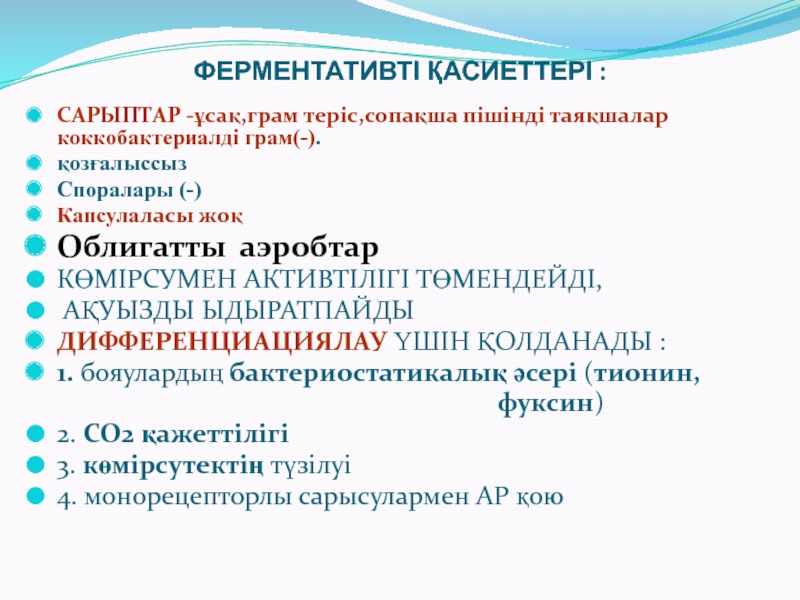 Ферменттік белсенділігі: глюкоза, левулеза-қы глицерин және мальтоза (+;-).