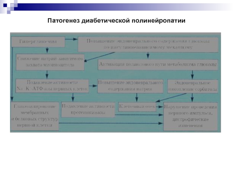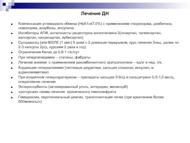 Патогенез ДН: -.1. Гипергликемия (гликирование белков, глюкотоксичность, усиление образования свободных радикалов, нарушение синтеза гепарансульфата, потеря зарядоселективности базальной мембраны); 2. гиперлипидемия; 3. развитие внутриклубочковой гипертензии; 4. генетические факторы