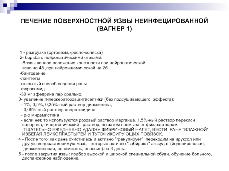 Слайд 20ЛЕЧЕНИЕ ПОВЕРХНОСТНОЙ ЯЗВЫ НЕИНФЕЦИРОВАННОЙ (ВАГНЕР 1)