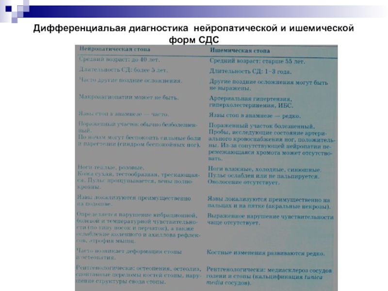 Слайд 17Дифференциальая диагностика нейропатической и ишемической форм СДС