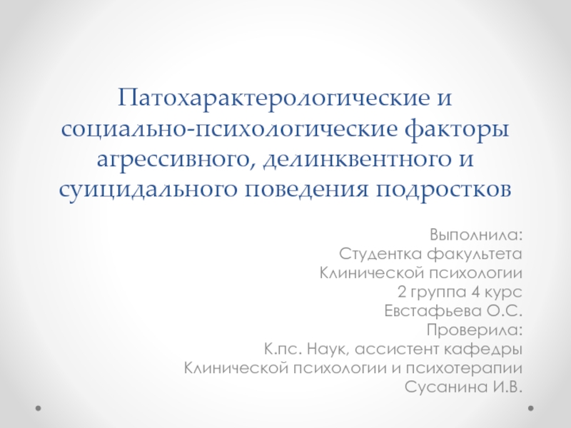 Слайд 1Патохарактерологические и социально-психологические факторы агрессивного, делинквентного и суицидального поведения подростков