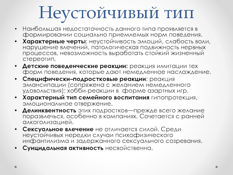 Характерные черты: неустойчивость эмоций, слабость воли, нарушение влечений, патологическая