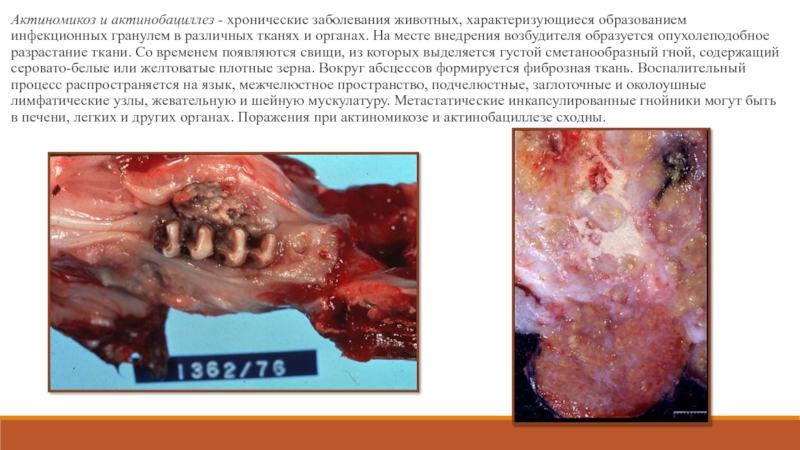 Слайд 34Актиномикоз и актинобациллез - хронические заболевания животных, характеризующиеся образованием инфекционных