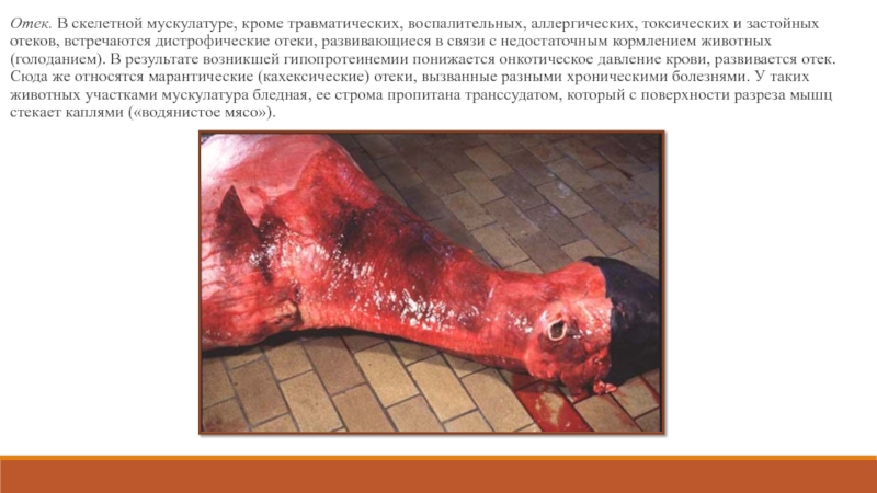 кормлением животных (голоданием). В результате возникшей гипопротеинемии понижается онкотическое давление крови, развивается отек. Сюда же относятся марантические (кахексические) отеки, вызванные разными хроническими болезнями. У таких животных участками мускулатура бледная, ее строма пропитана транссудатом, который с поверхности разреза мышц стекает каплями («водянистое мясо»).