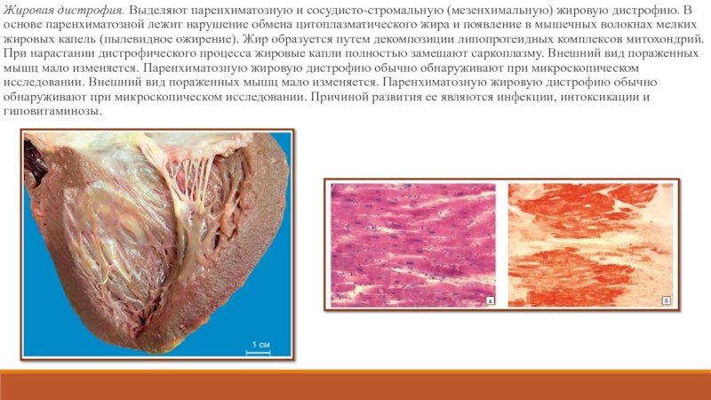 Слайд 7Жировая дистрофия. Выделяют паренхиматозную и сосудисто-стромальную (мезенхимальную) жировую дистрофию. В